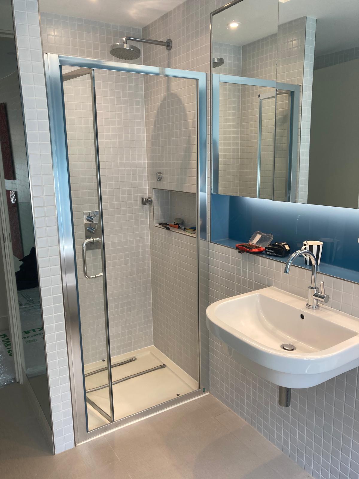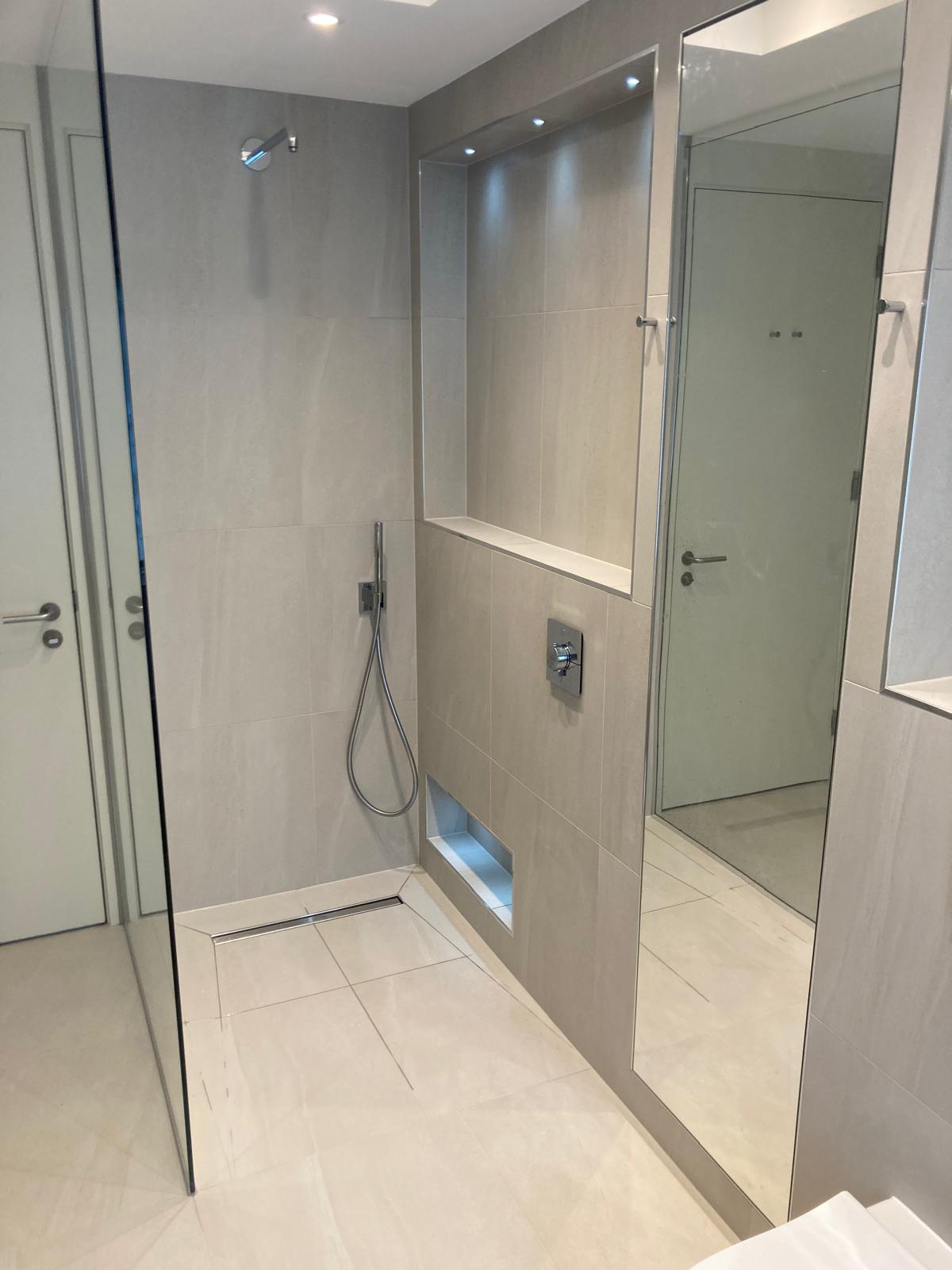The completed bathroom delivers a clean, modern and highly functional result. The use of large-format tiles creates a seamless look with minimal grout lines, improving both aesthetics and maintenance.