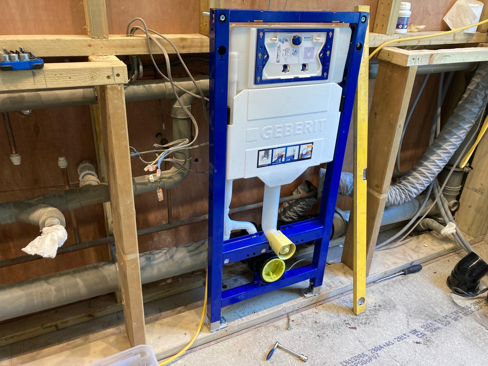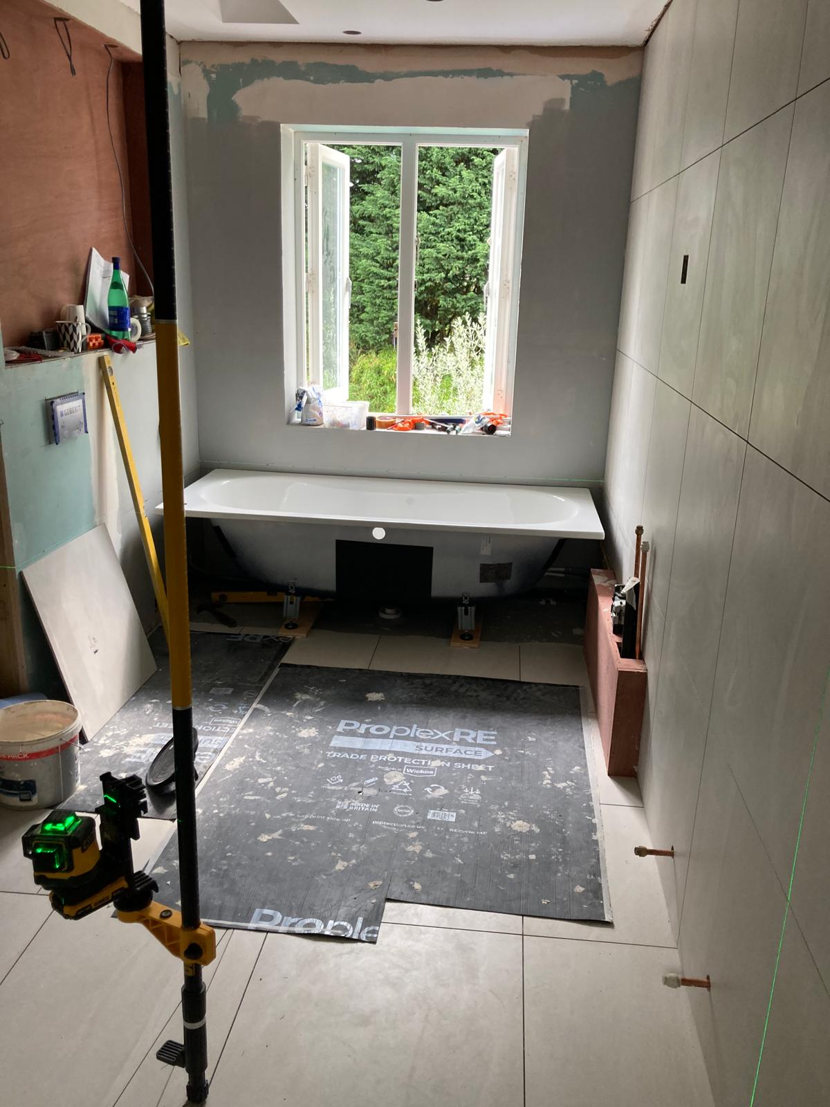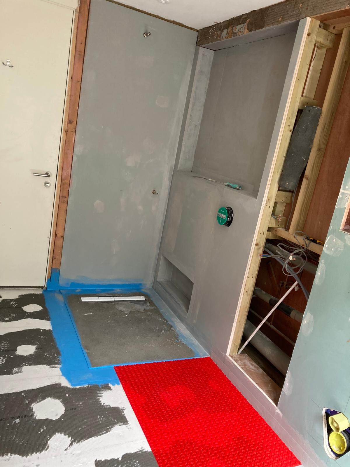 During the construction phase, the bathroom was completely reworked. New plumbing systems were installed, surfaces were prepared for tiling, and structural adjustments ensured long-term durability.
