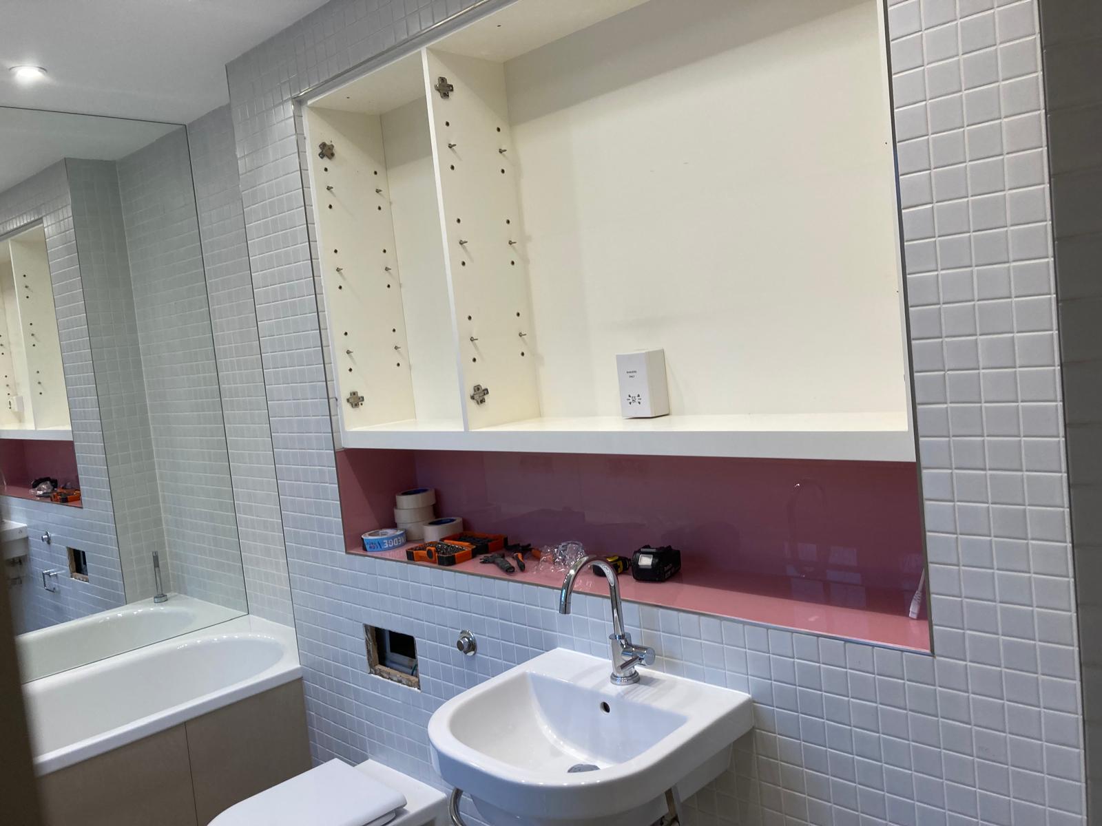 The completed bathroom features a floating vanity unit with a countertop basin, paired with a large illuminated mirror that adds both practicality and visual impact.