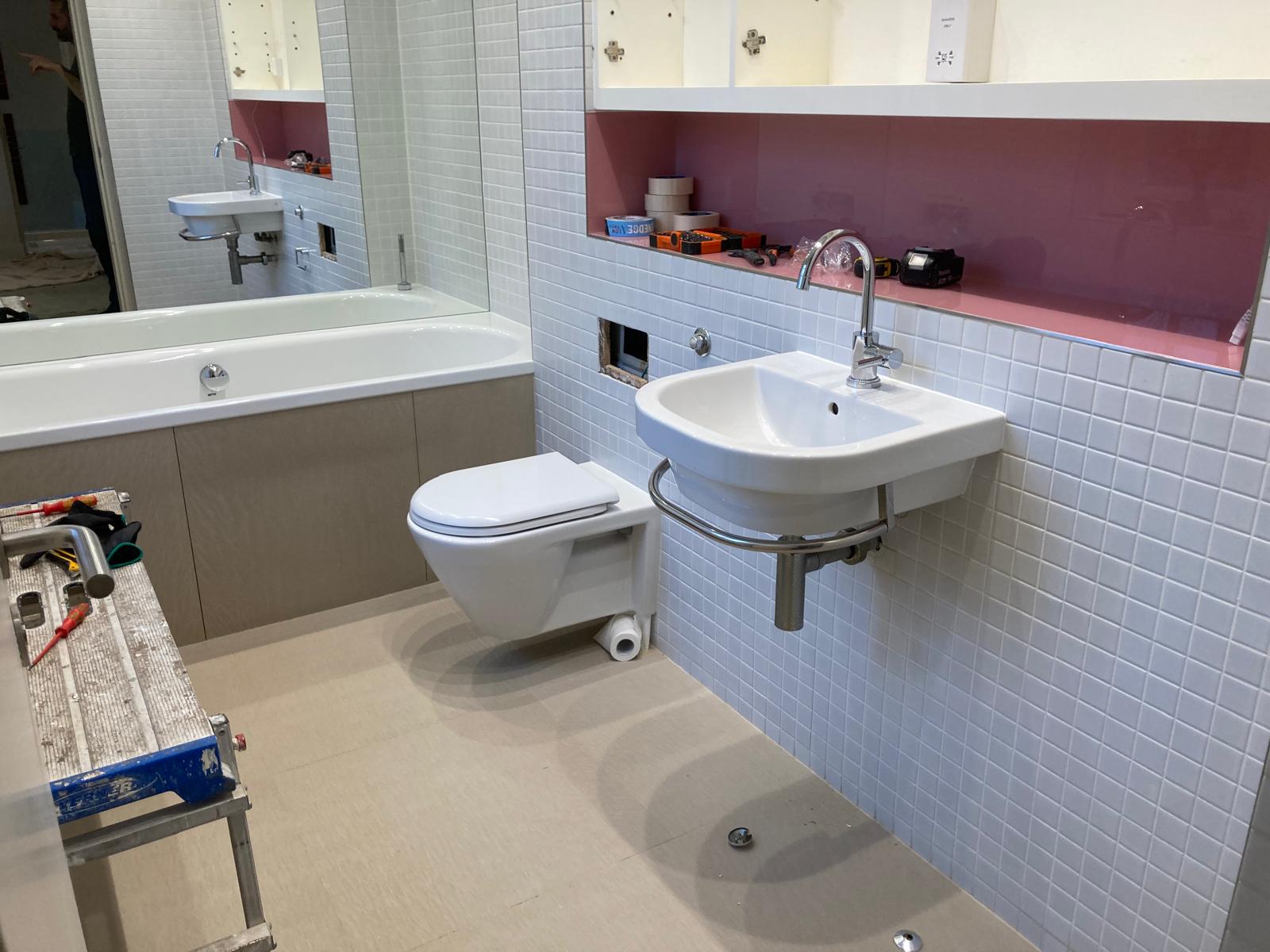At this stage, all pipework was exposed and redesigned to suit the new layout, allowing for a more efficient and modern bathroom configuration.
